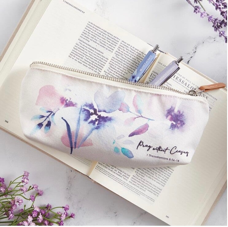 The Pray Without Ceasing Pencil Pouch, a practical and inspiring accessory for your prayer journey. Adorned with the empowering message Pray Without Ceasing from 1 Thessalonians 5:37, and featuring elegant variations of stunning purple hues, this pouch is as beautiful as it is functional. Perfect for storing pens, pencils, markers, or any other small items, it serves as a gentle reminder to maintain a continual connection with the Divine throughout your day. Whether for church, work, or personal use, this pencil pouch is a delightful companion that adds a touch of spiritual elegance